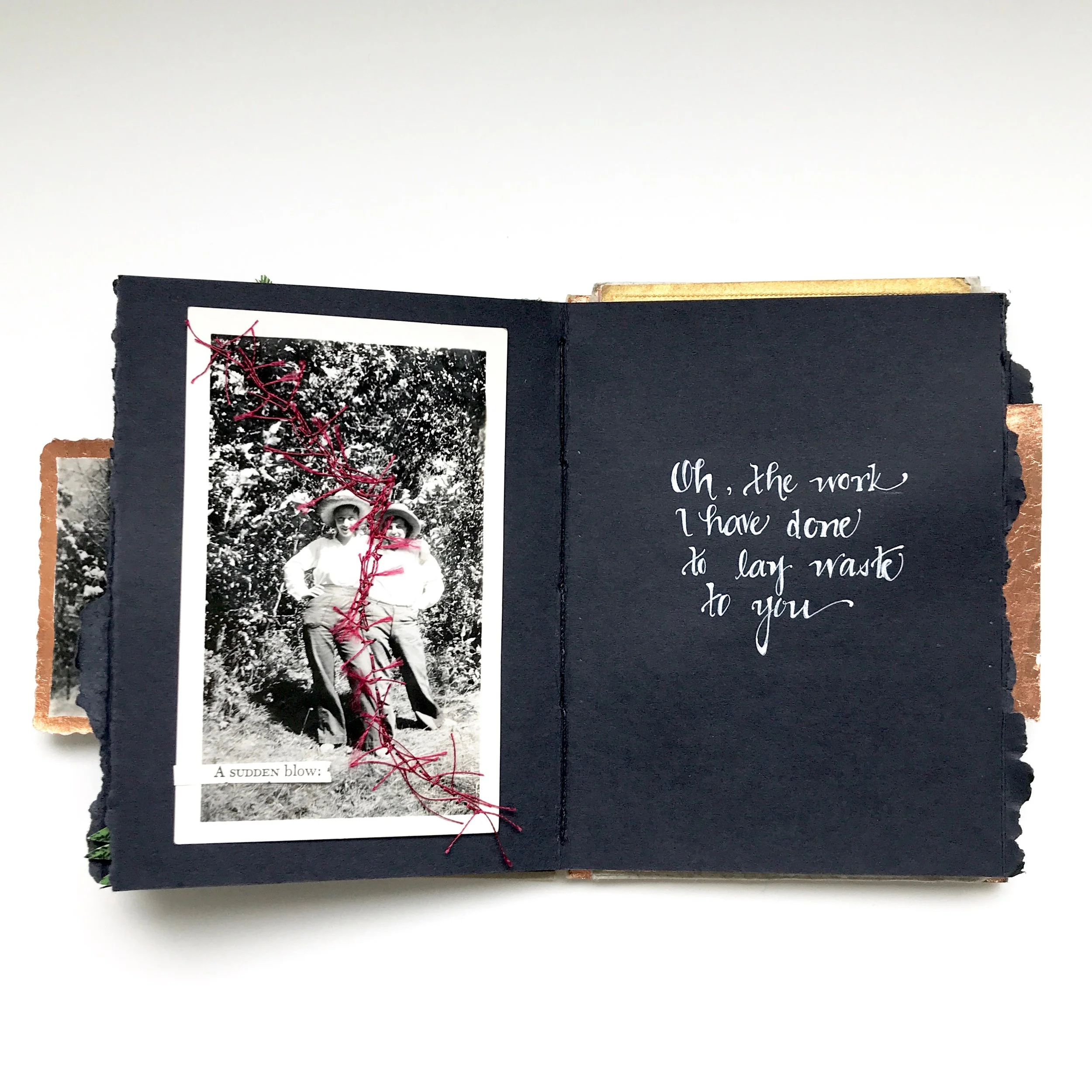 mixed media, handcut photographs, ink, copper leaf, thread, book type, paper ephemera